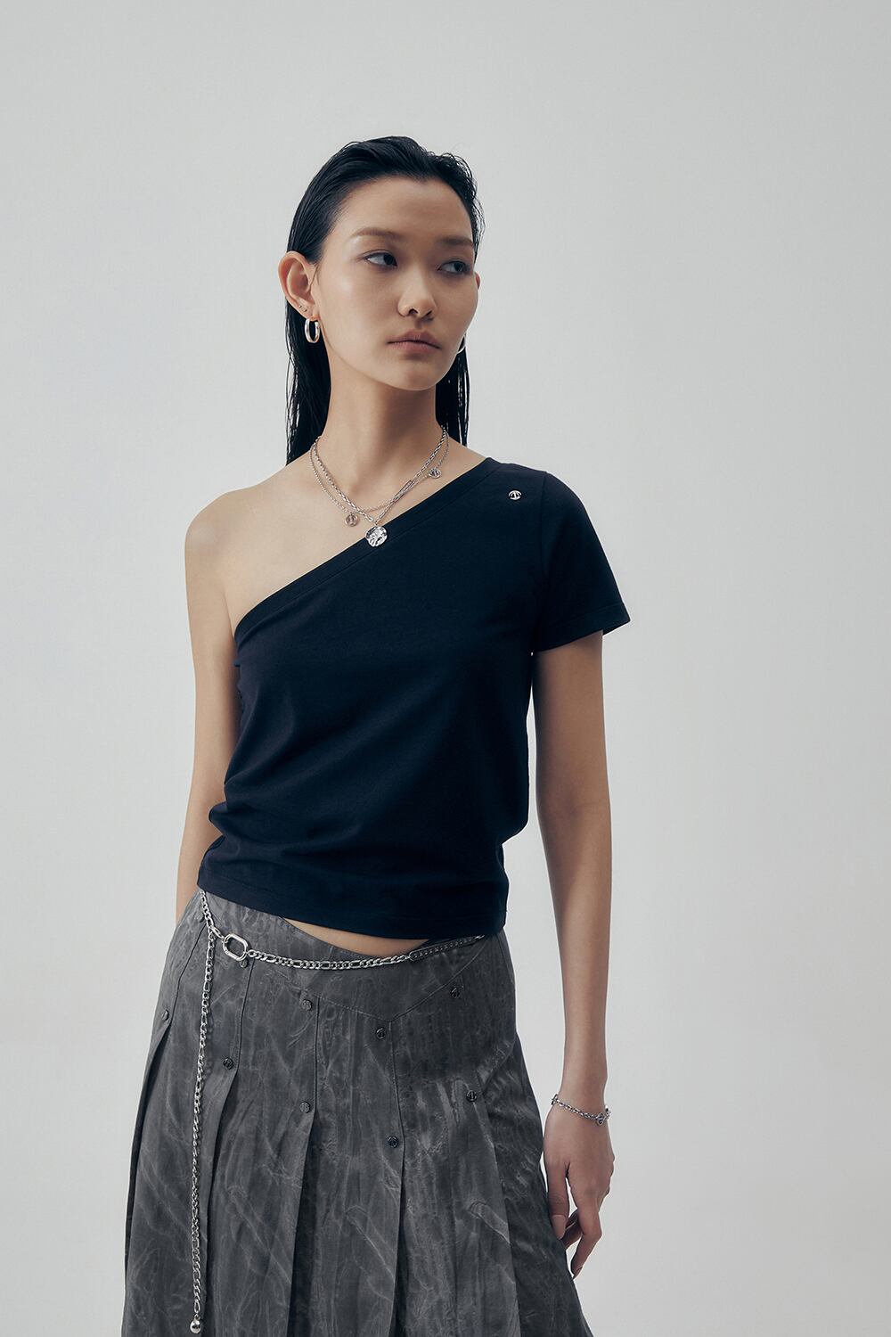 [TREEMINGBIRD] One-Shoulder Sleeve T-shirts [ Black ]