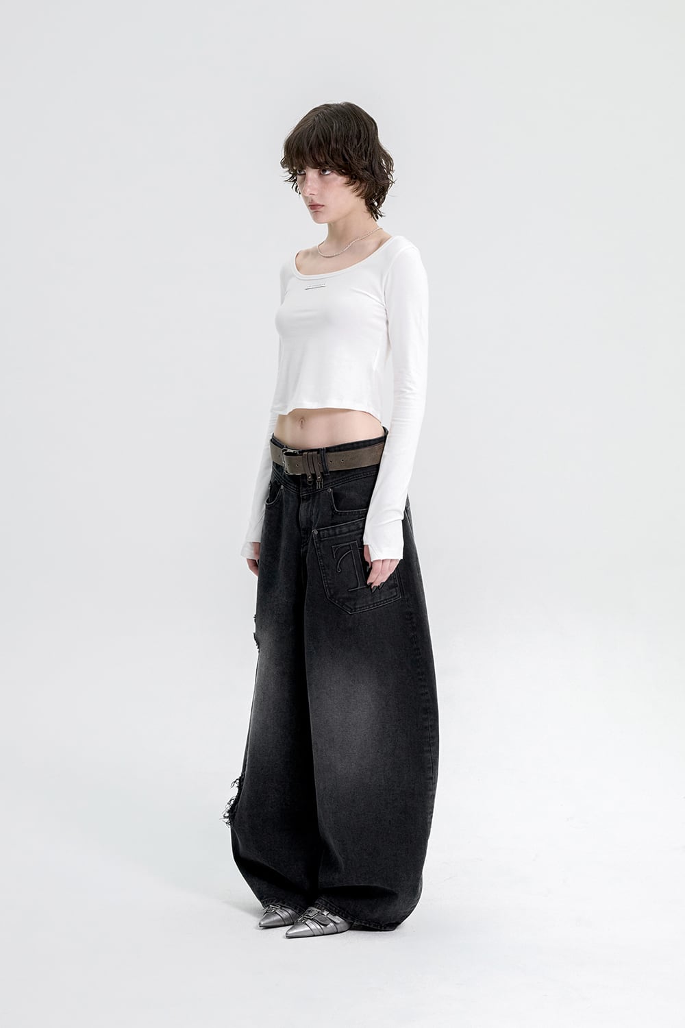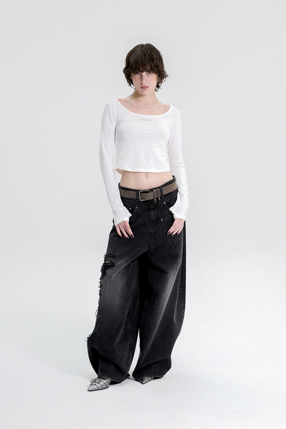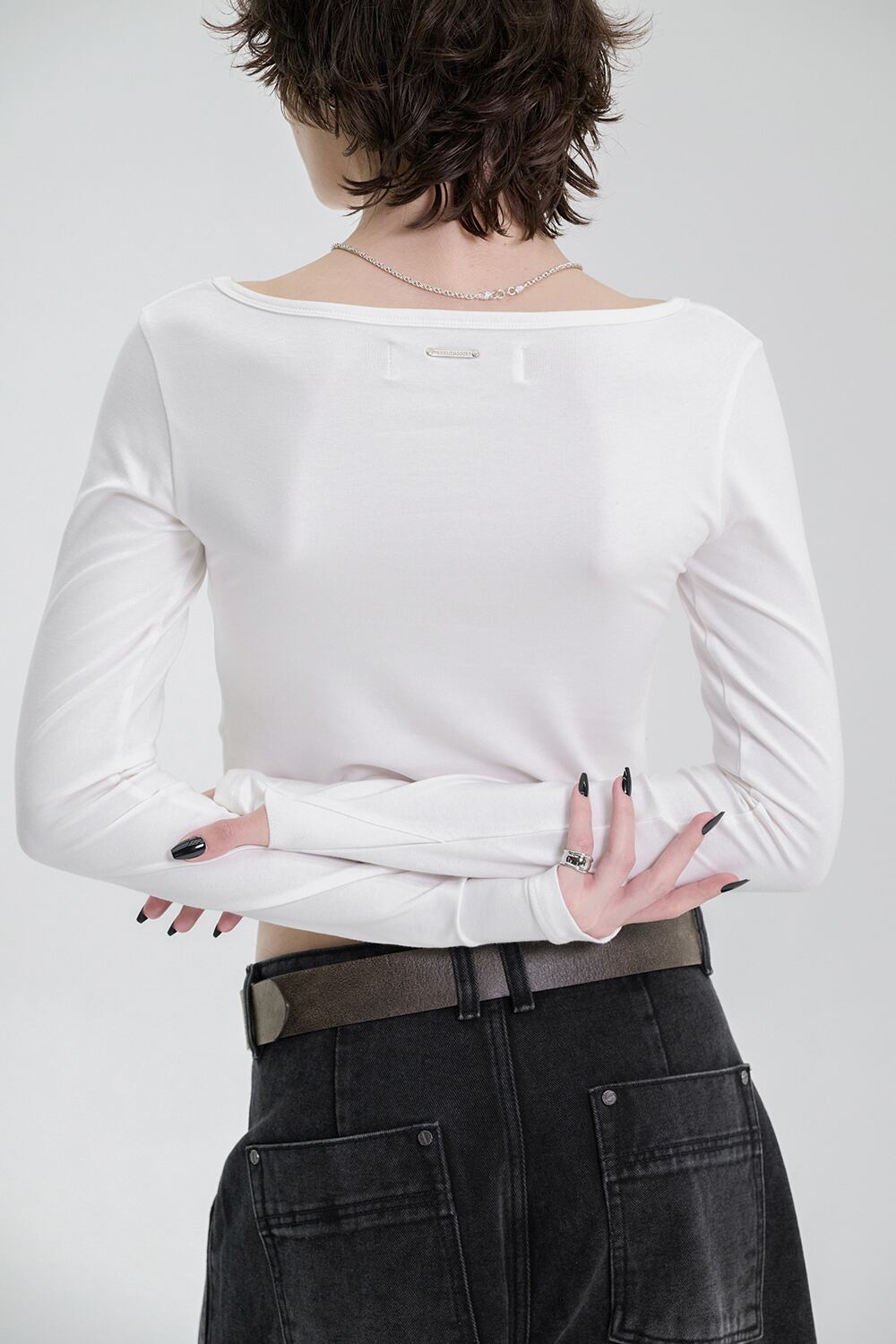 [TREEMINGBIRD] Scoop Neck Finger Hole Long Sleeve [ White ]