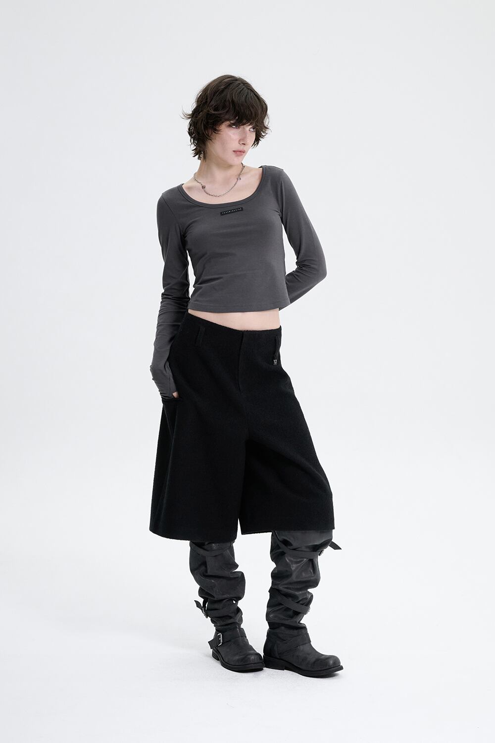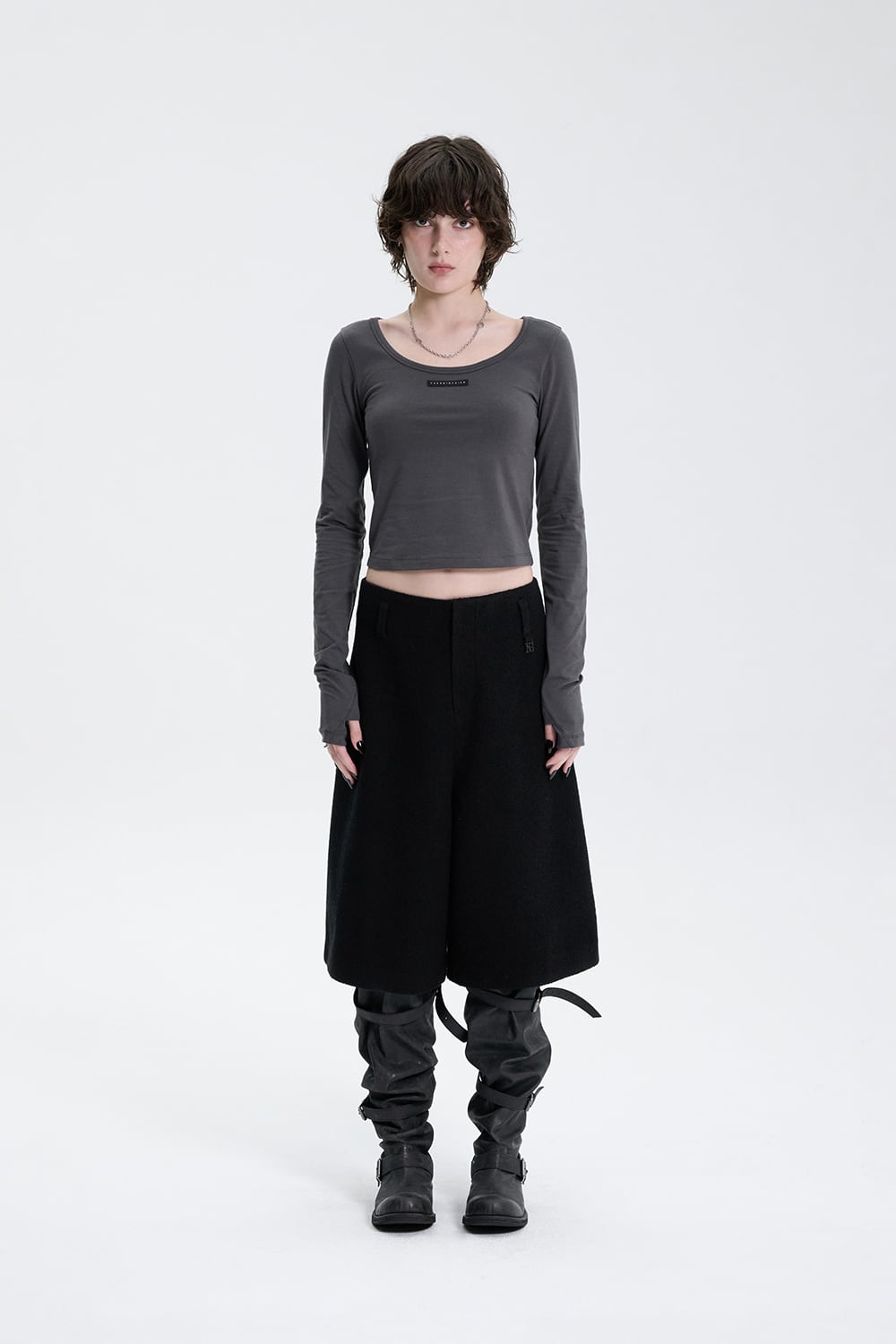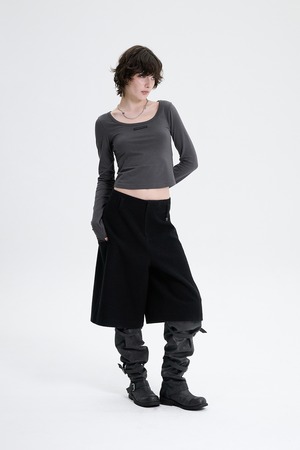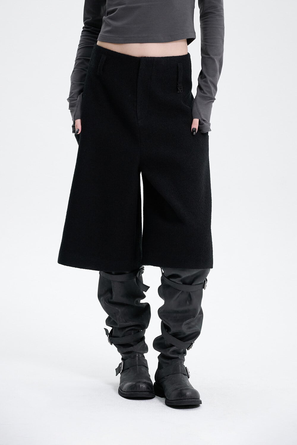 [TREEMINGBIRD] Crop Tweed Set-up Pants [ Black ]
