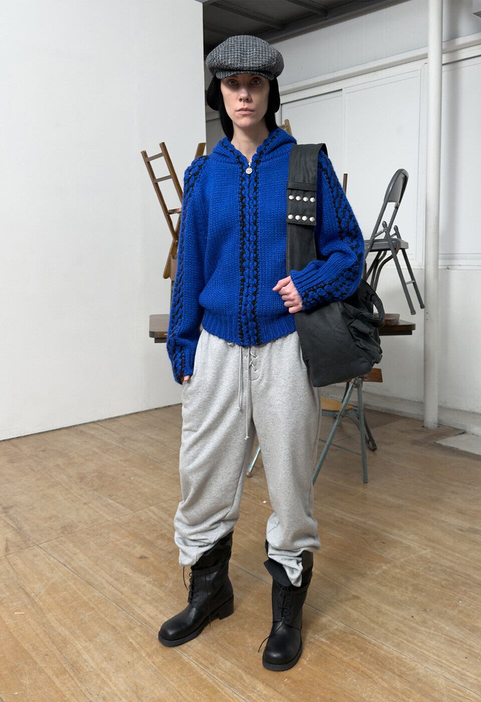 [OPEN YY] STITCH ZIP UP KNIT HOODIE, BLUE