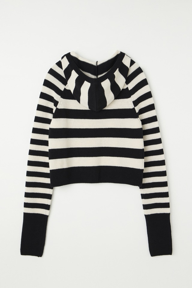 デイリーに着用できるニットフーディーです。親指用のスリットがあり、冬には手袋の代わりに手を包むことができます。Mサイズはクロップ丈、Lサイズは程よいオーバーサイズです。
