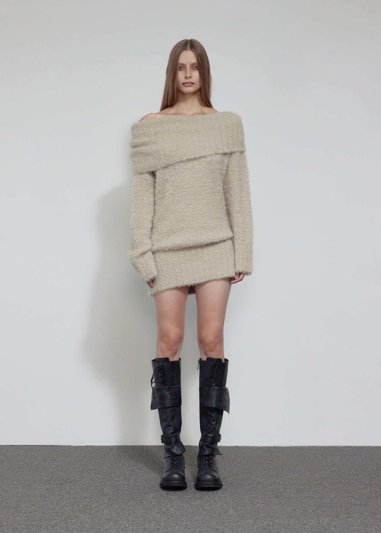 [BOHEMIAN SEOUL] OFF SHOULDER BOUCLE KNIT, BEIGE