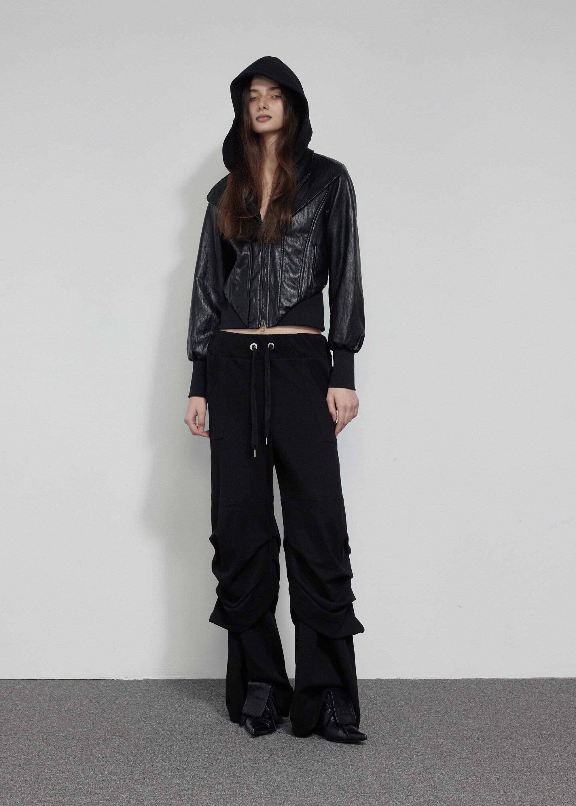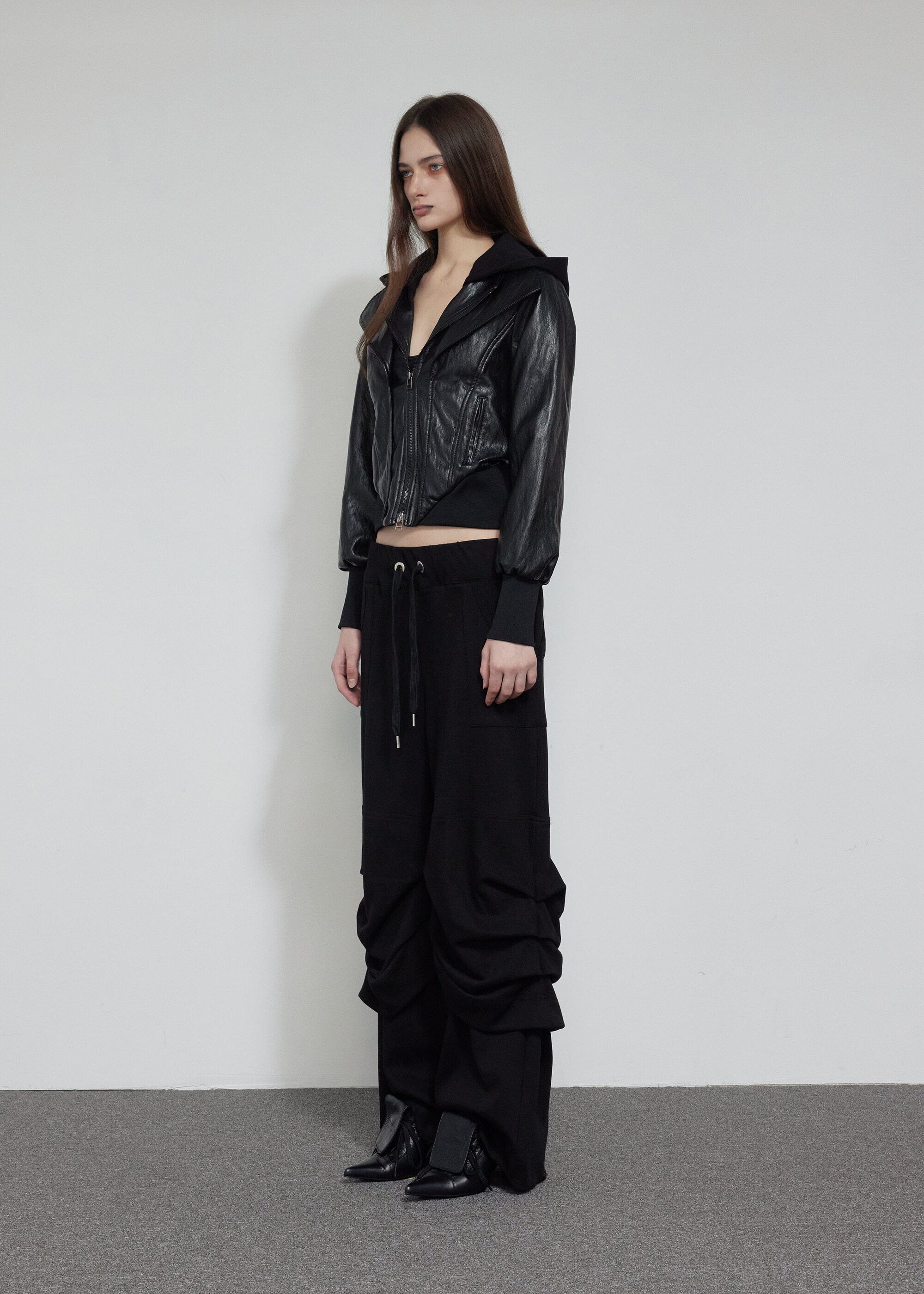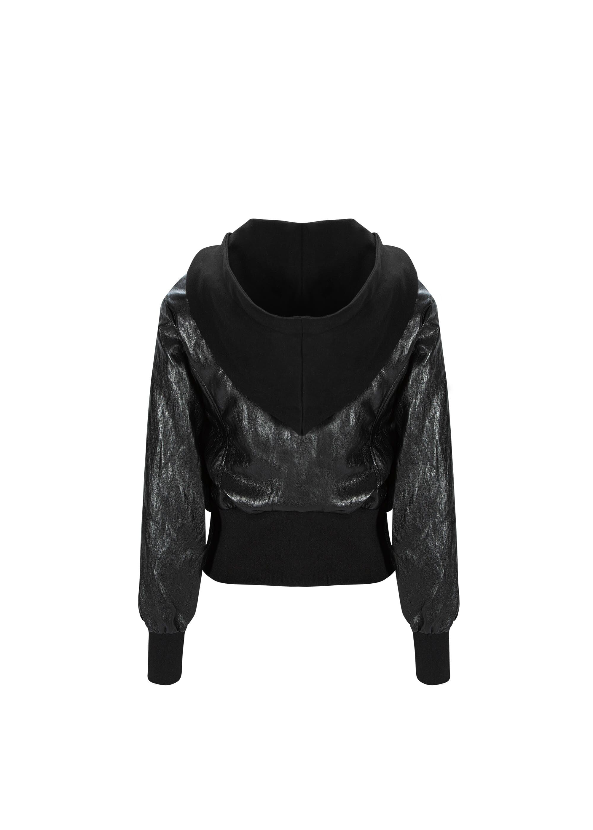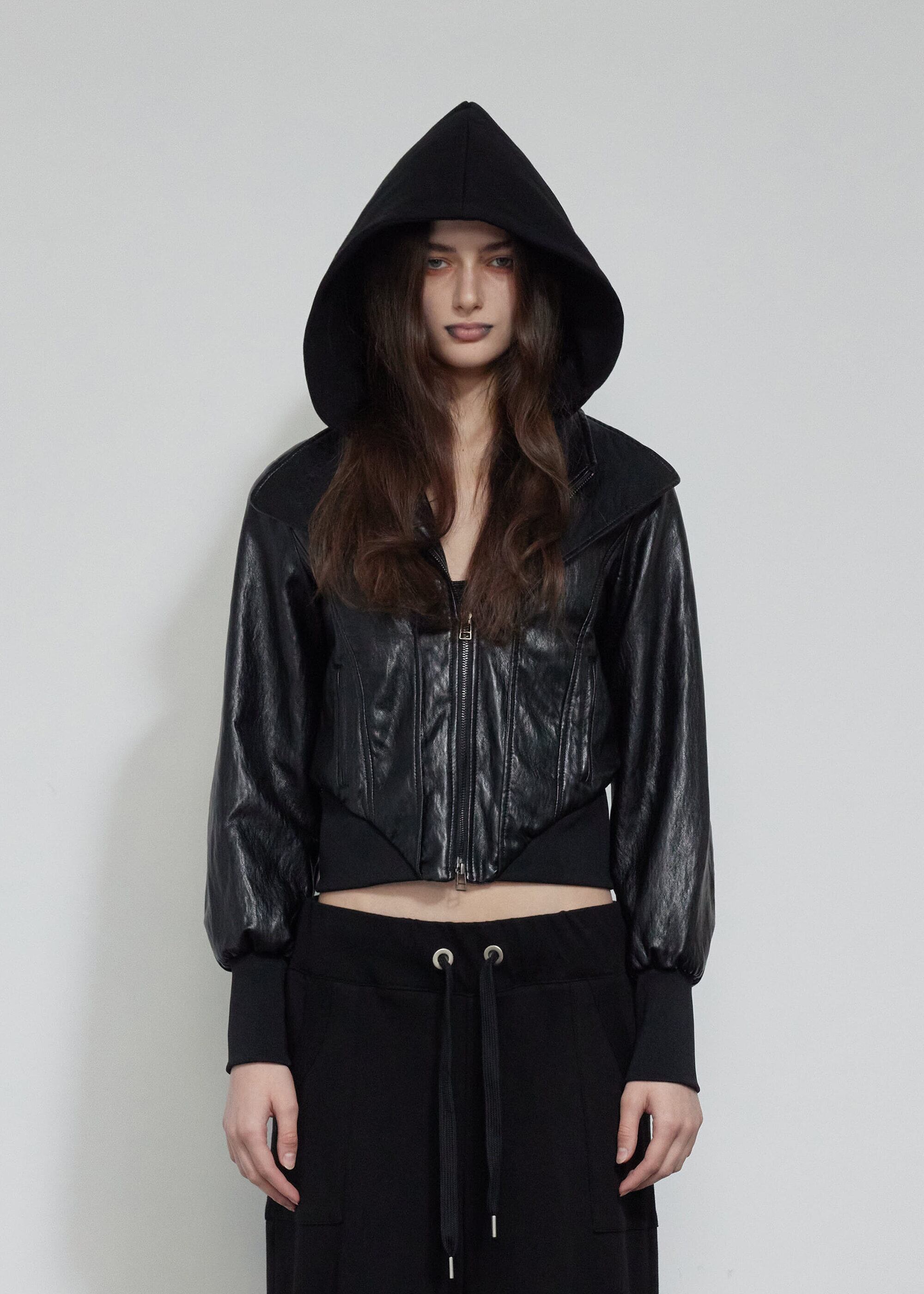 [BOHEMIAN SEOUL] LAYERED HOODIE LEATHER JACKET, BLACK