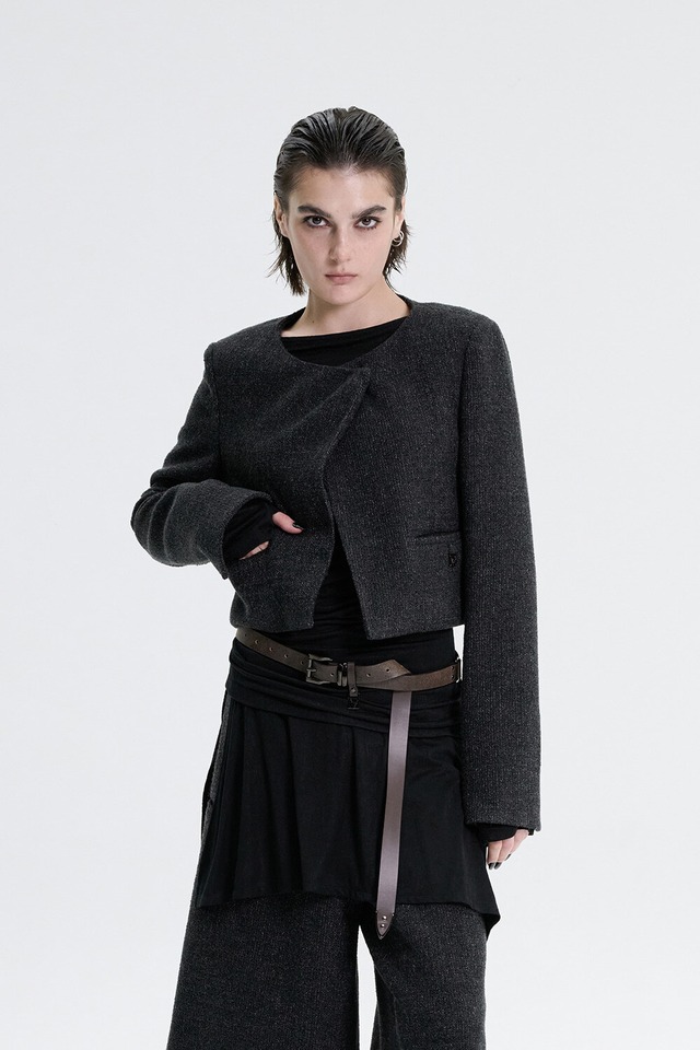 [TREEMINGBIRD] Crop Tweed Set-up Jacket [ Charcoal ]