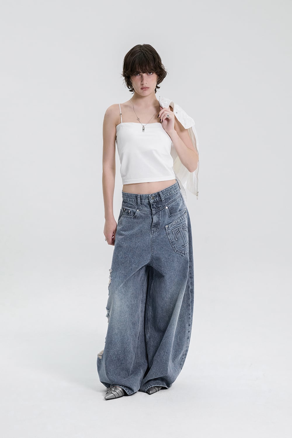 [TREEMINGBIRD] Balloon Fit Damage Denim Pants [ Blue ]