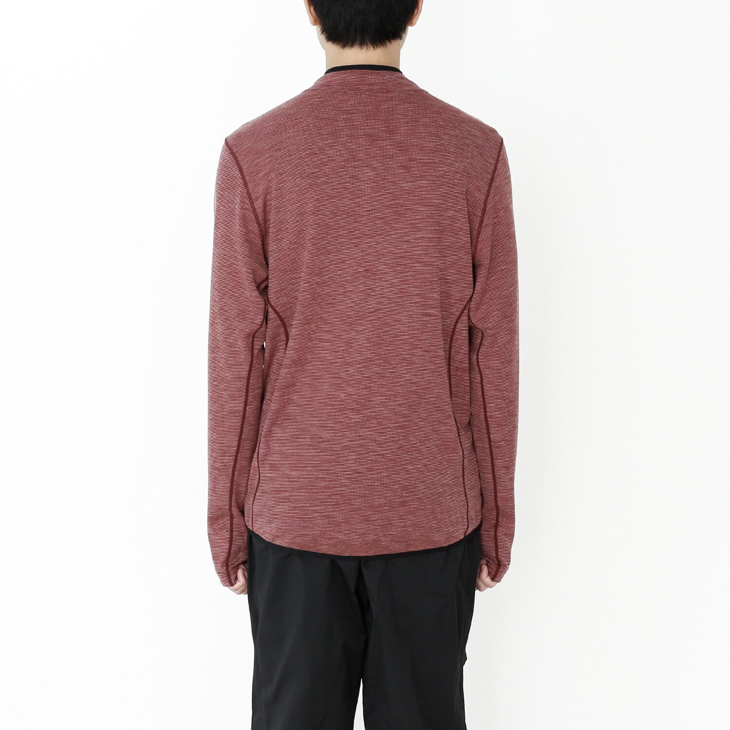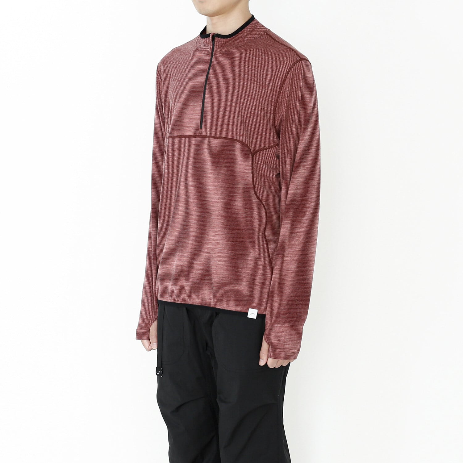 メリノウール(17.5ミクロン)とクールマックスをメインに編み立てた生地で作られたハーフジップです。