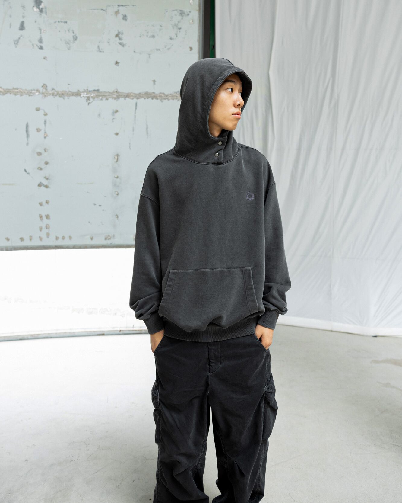 [999HUMANITY] NECK SNAP DYEING HOODIE (CHARCOAL) 正規品 韓国 ブランド 韓国ファッション 韓国代行 999 ヒューマニティ HUMANITY 日本 店舗