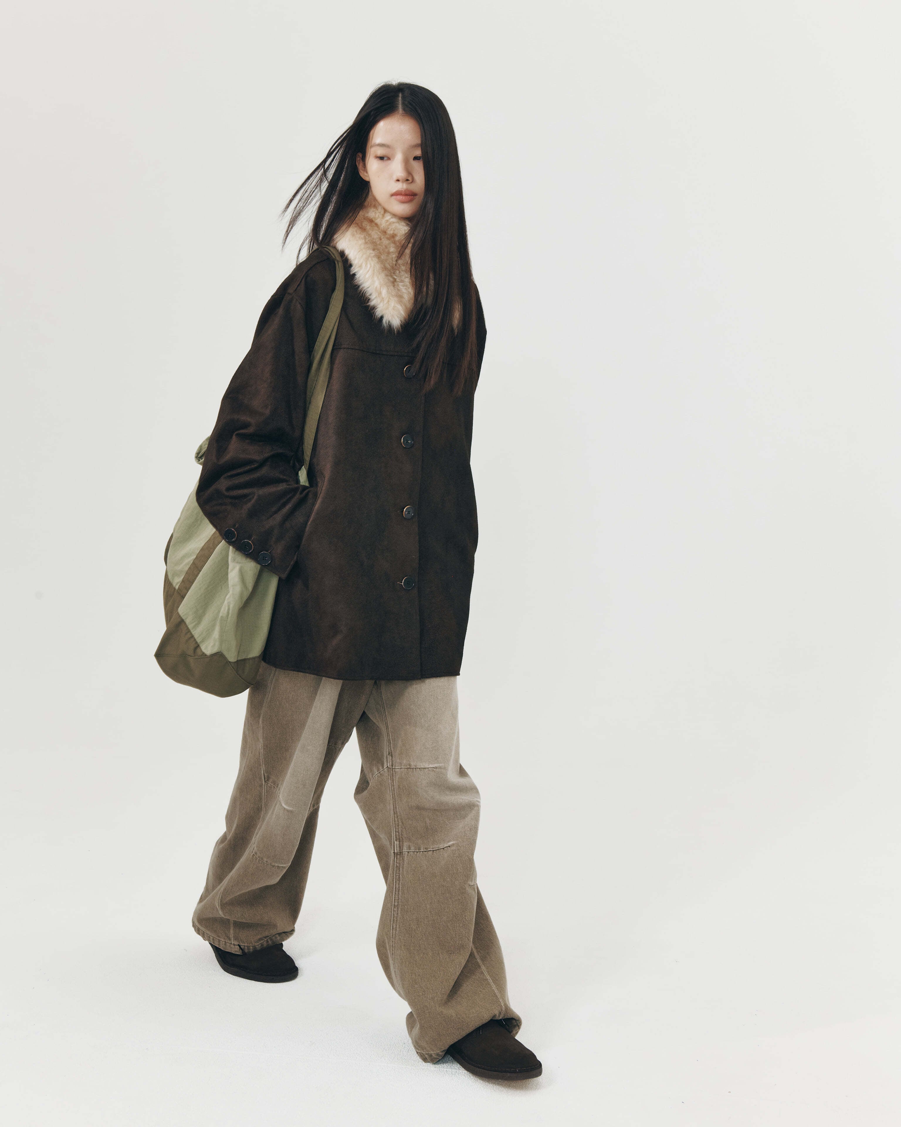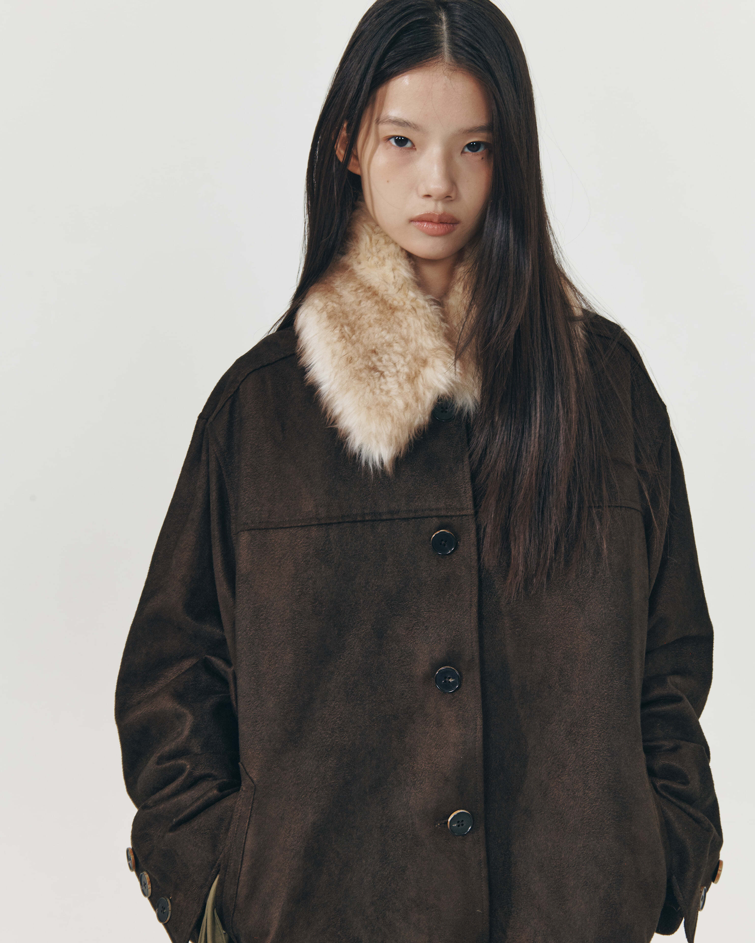 [999HUMANITY] OVERSIZED FAUX SUEDE CAR COAT (DARK BROWN) 正規品 韓国 ブランド 韓国ファッション 韓国代行 999 ヒューマニティ HUMANITY 日本 店舗