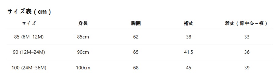 下記のサイズ表をご参照ください。
