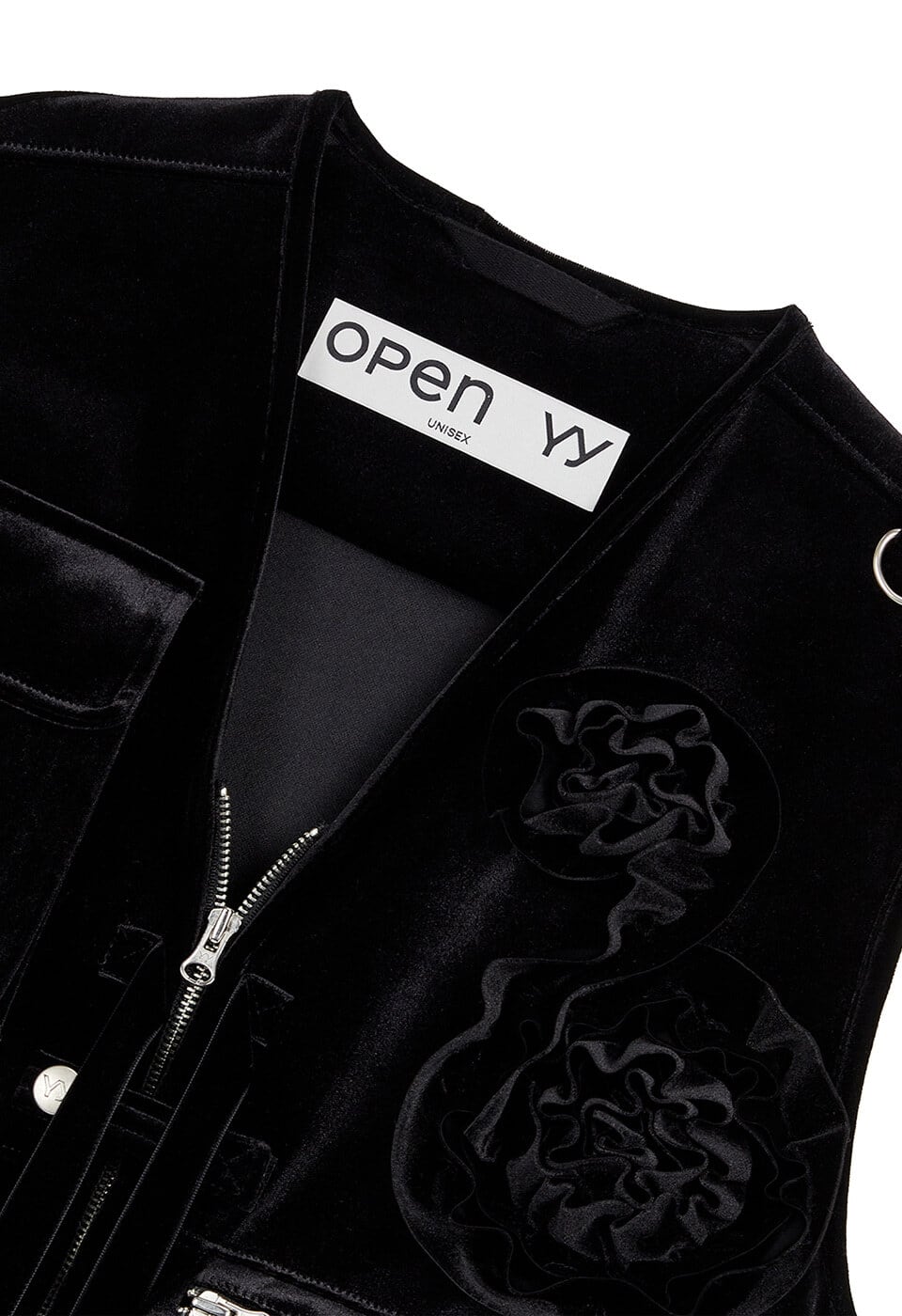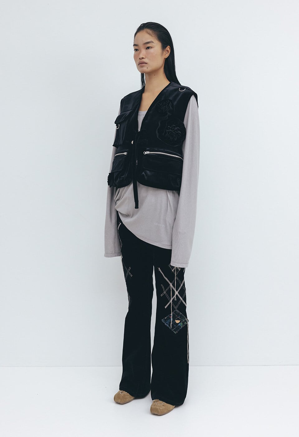 [OPEN YY] VELVET APPLIQUÉ CARGO VEST, BLACK