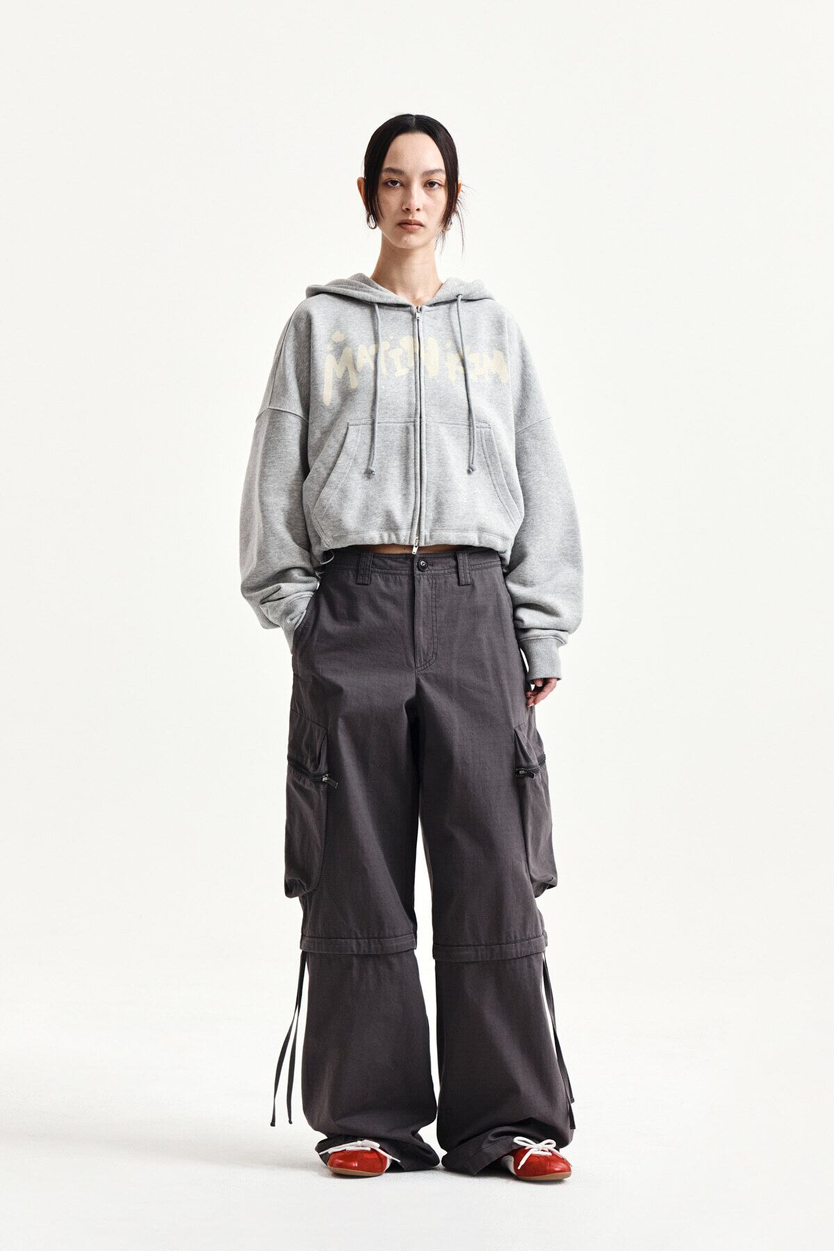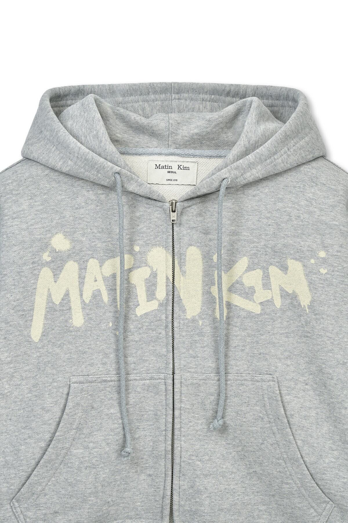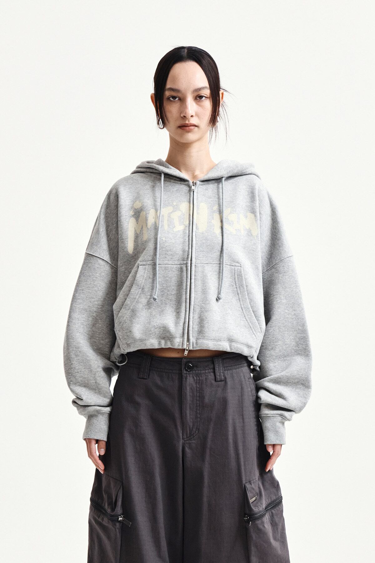 [Matin Kim] GRAFFITI LOGO CROP HOODY ZIP UP IN GREY 正規品 韓国ブランド 韓国通販 韓国代行 韓国ファッション マーティンキム matinkim 日本 店舗