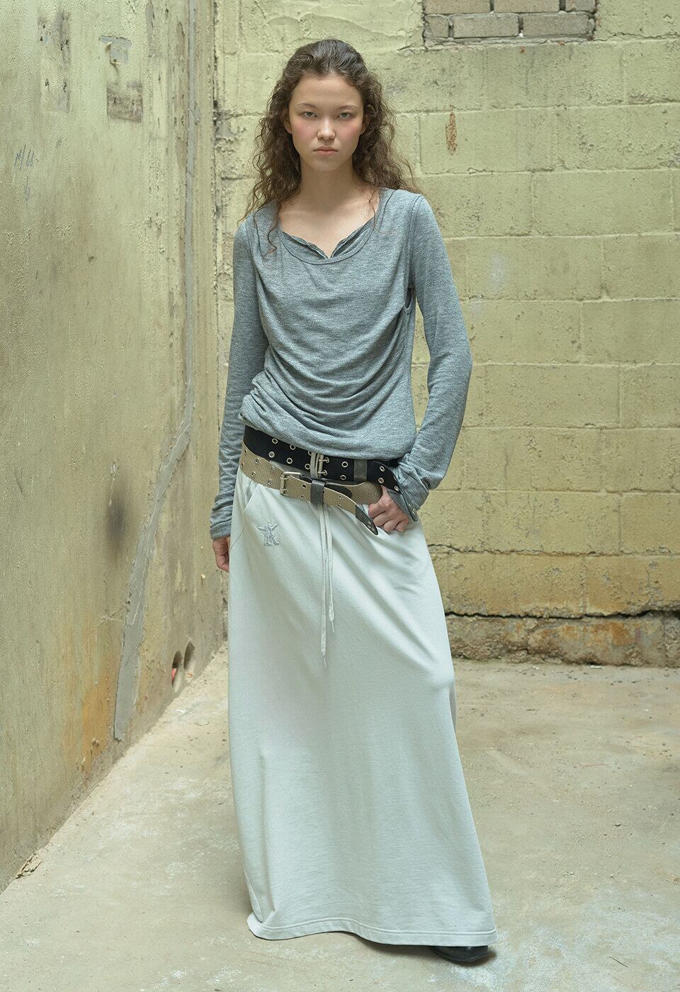 [OPEN YY] SLANT JERSEY SKIRT, LIGHT GRAY