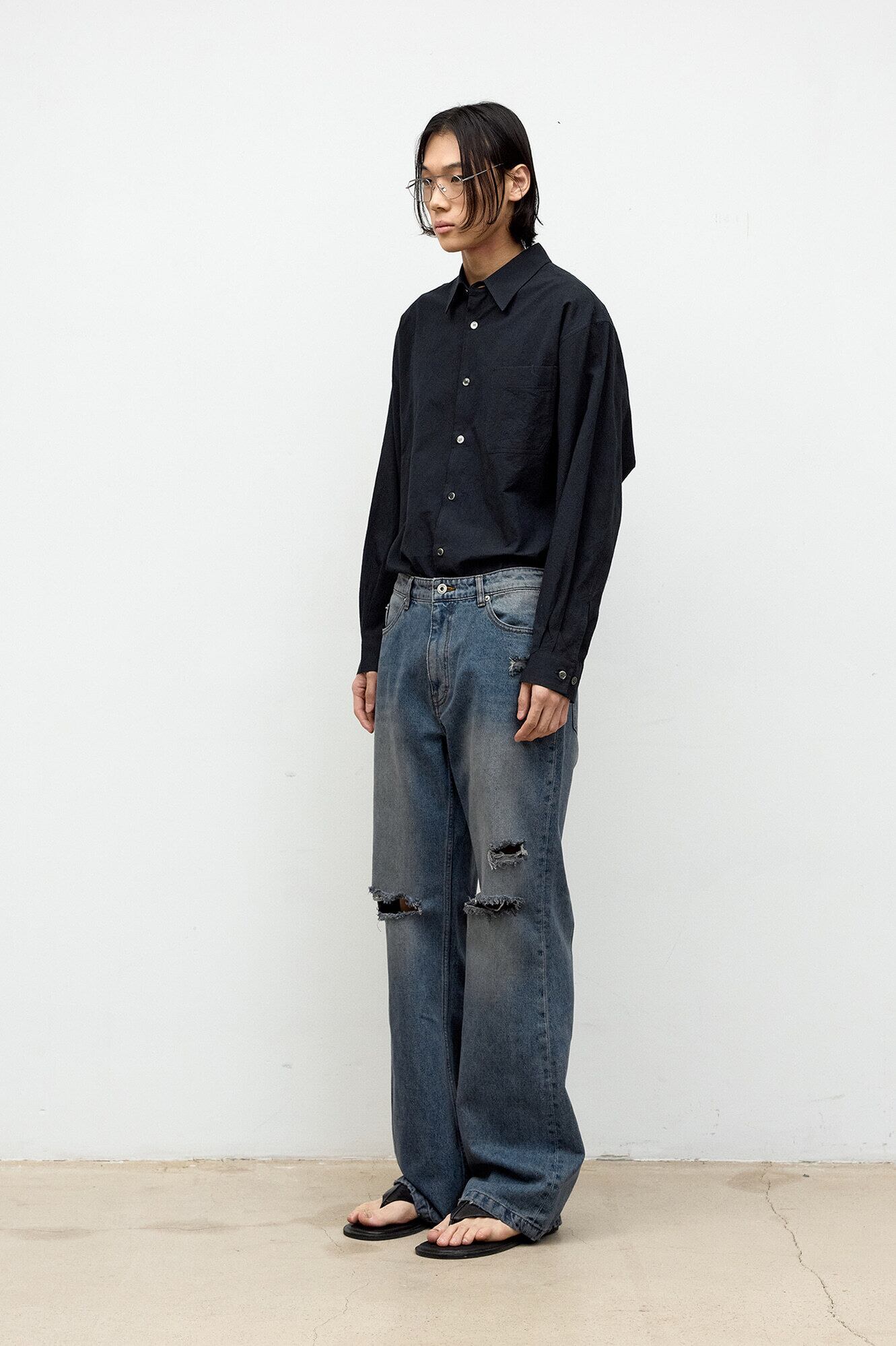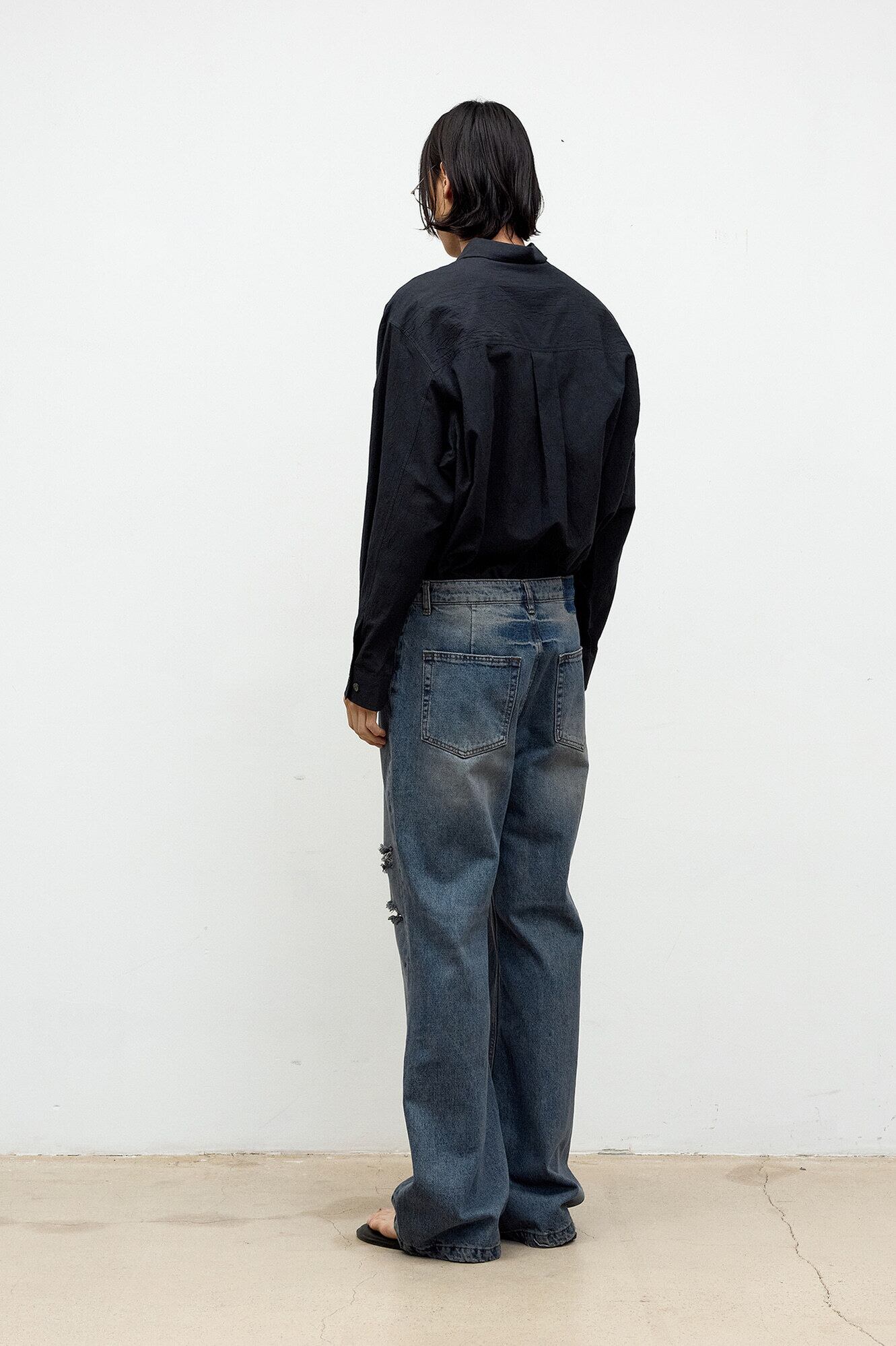 [COOR] Distressed Semi Flare Jeans (Washed Indigo)
