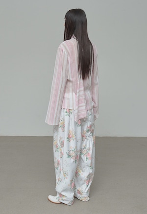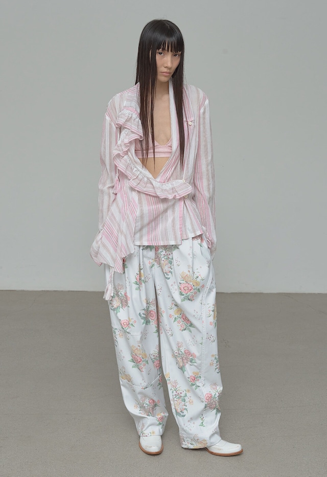 [OPEN YY] UNBALANCED RUFFLE STRIPE BLOUSE, PINK 正規品 韓国ブランド 韓国通販 韓国代行 韓国ファッション オープン ワイワイ 日本 店舗