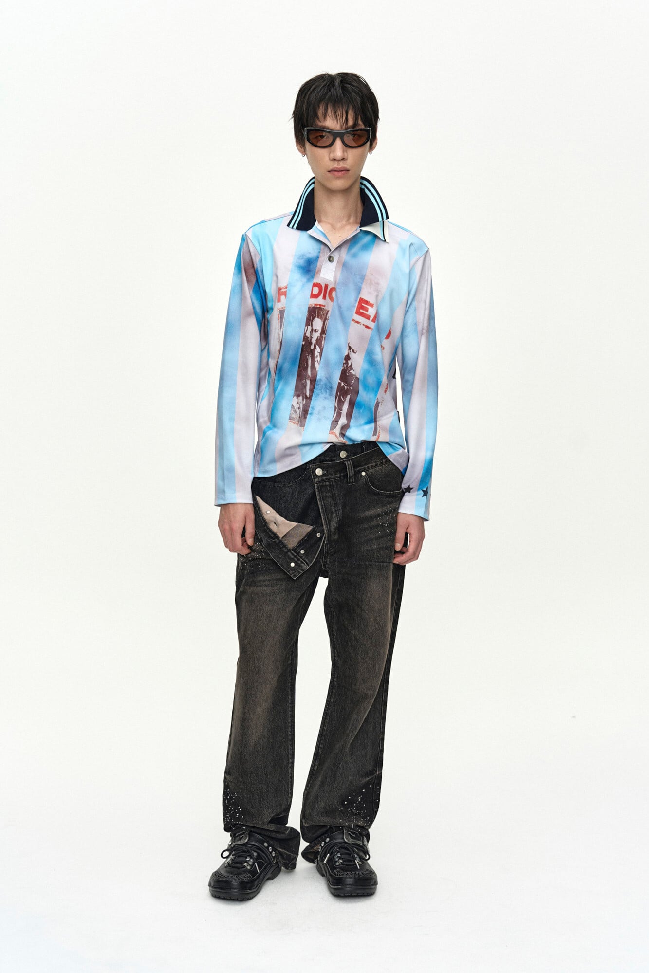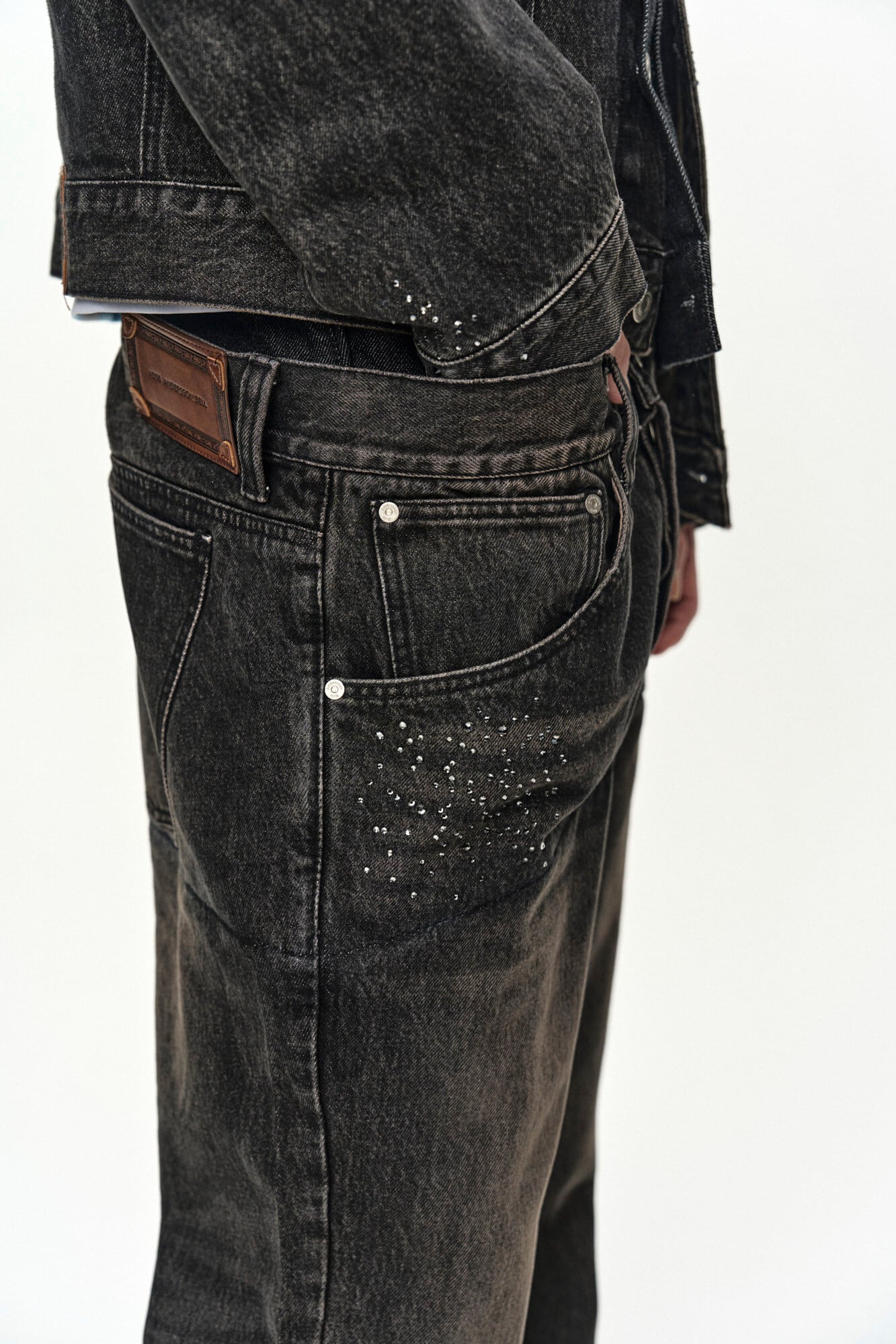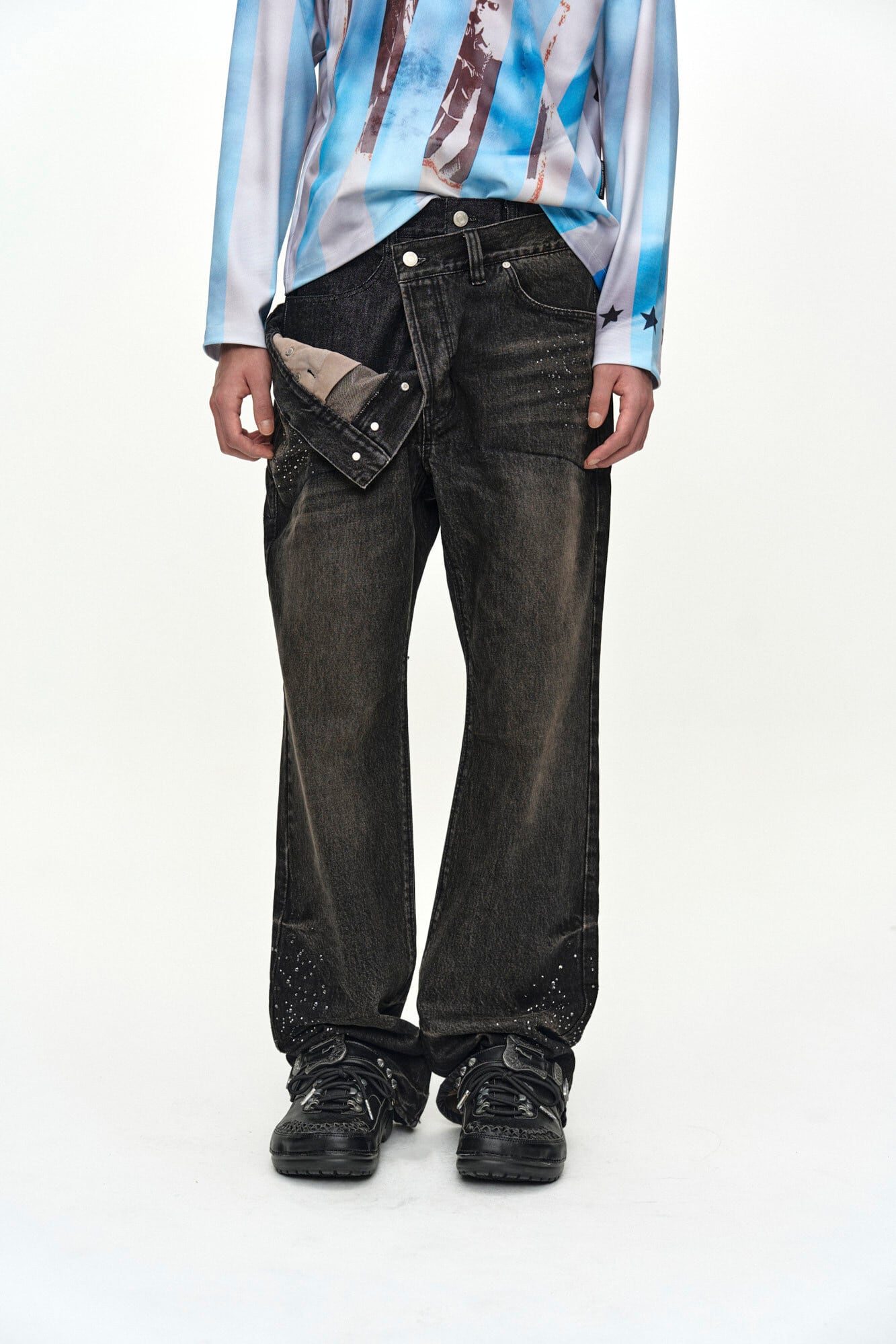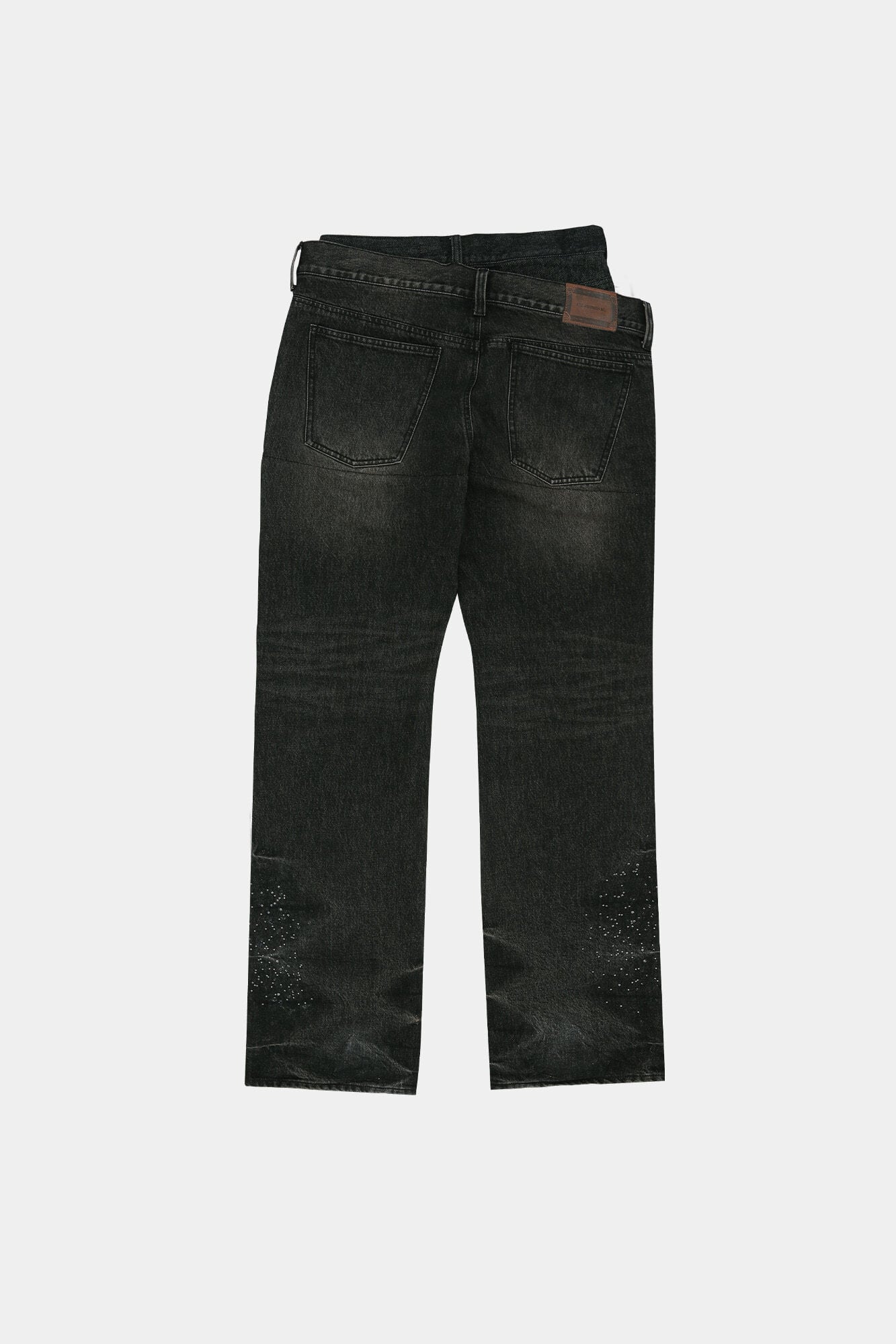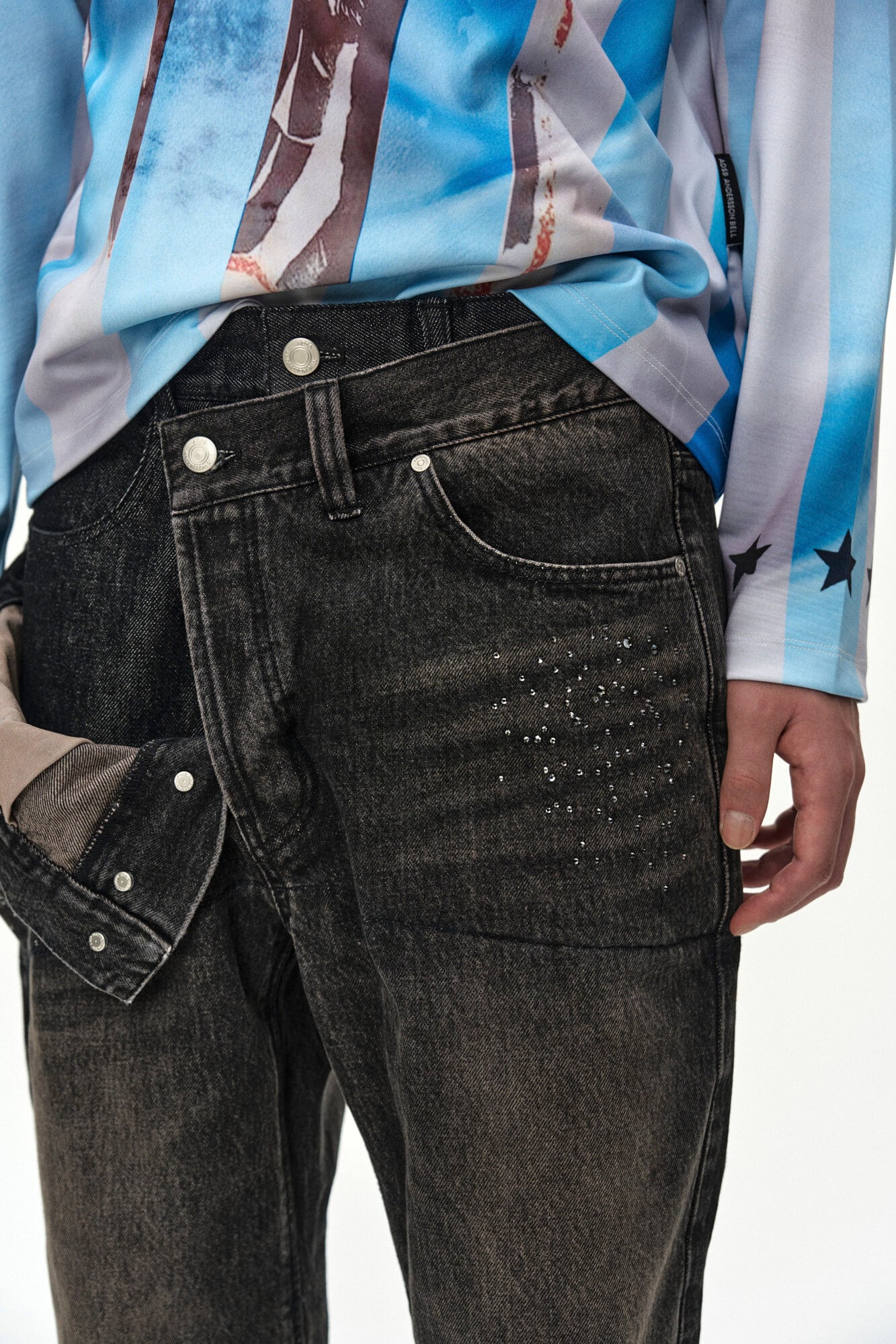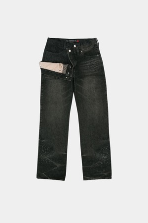 [ANDERSSON BELL] UNISEX ASYMMETRIC LAYERED HOT-FIX WIDE-LEG JEANS apa912u(BLACK)