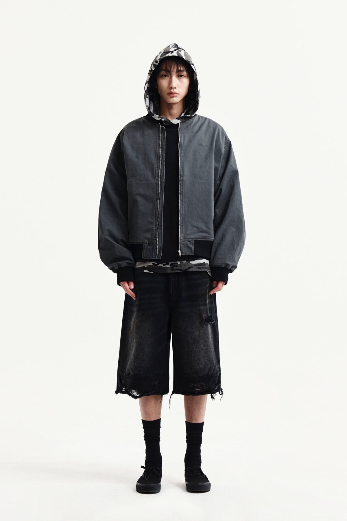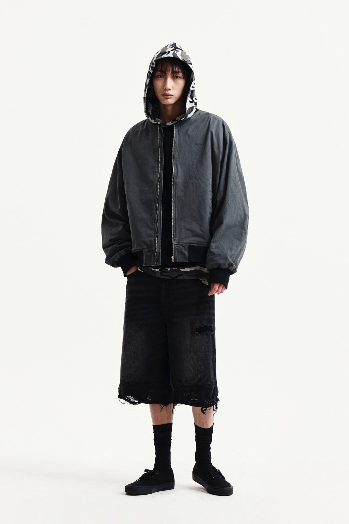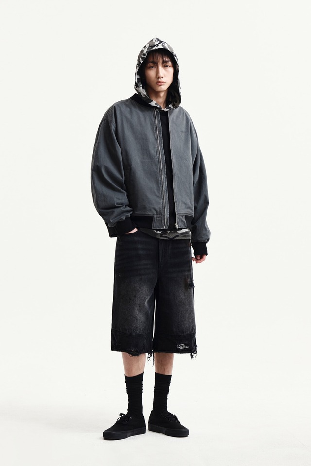 [Matin Kim] DESTROYED BERMUDA DENIM PANTS FOR MEN IN BLACK 正規品 韓国ブランド 韓国通販 韓国代行 韓国ファッション マーティンキム matinkim 日本 店舗