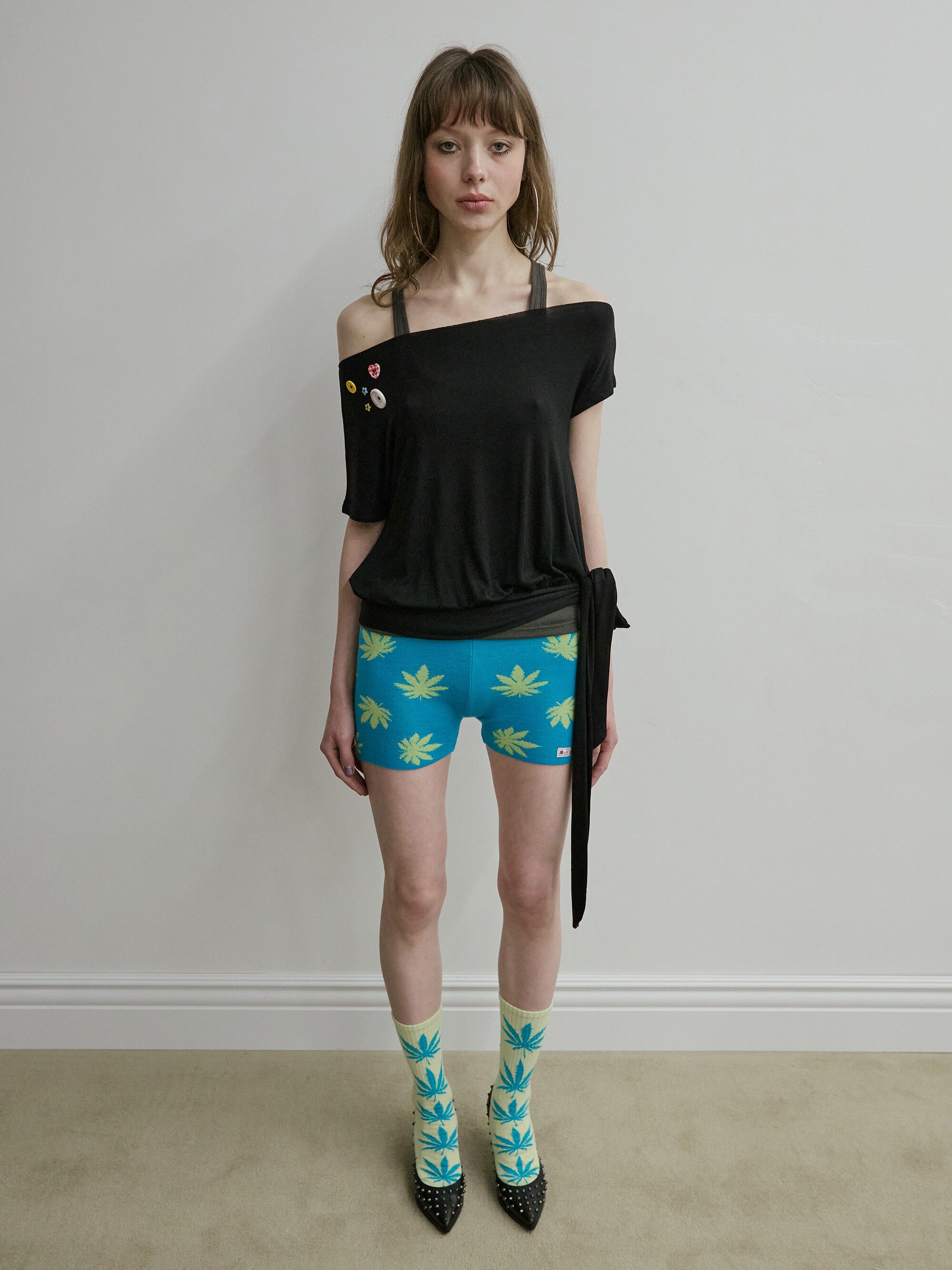 [SCULPTOR] Off-Shoulder Button Tee Black
