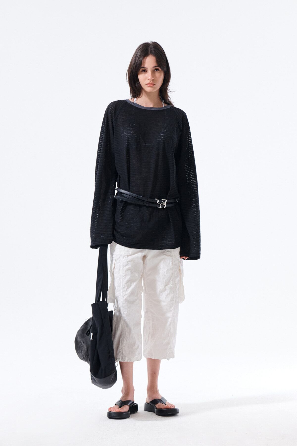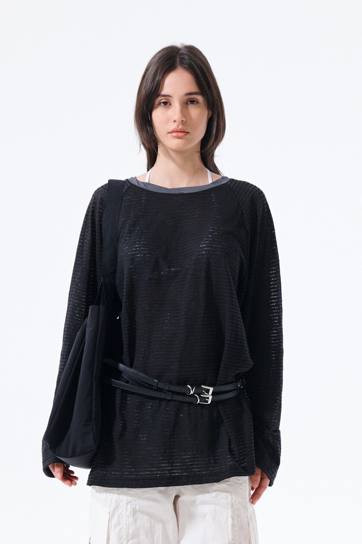 [Matin Kim] TWIST BOAT NECK STRIPE LOGO TOP IN BLACK