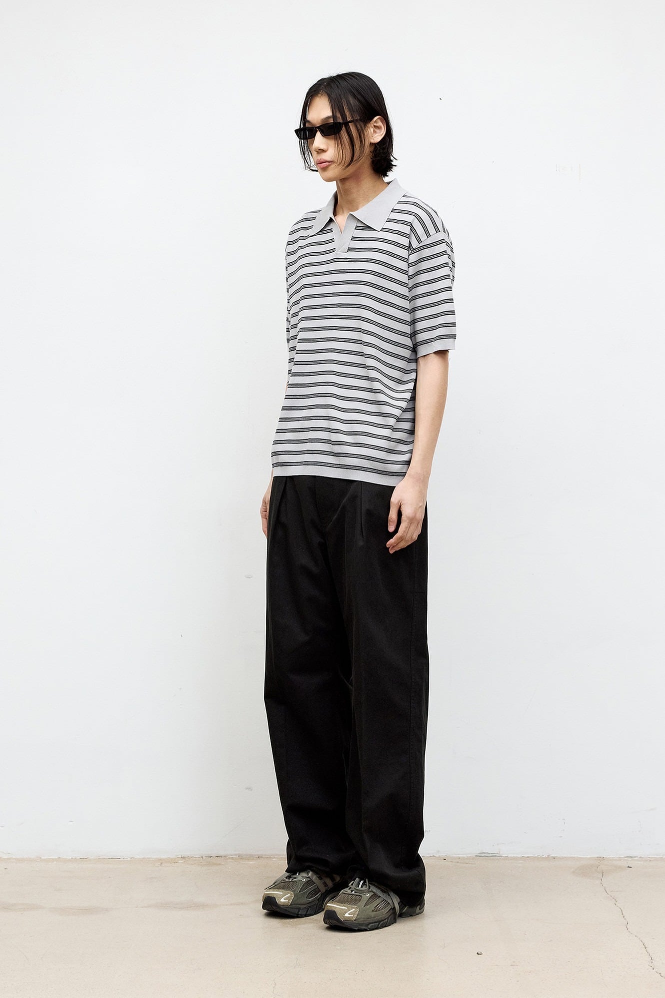 [COOR] Open Collar Stripe Sweater (Light Gray)
