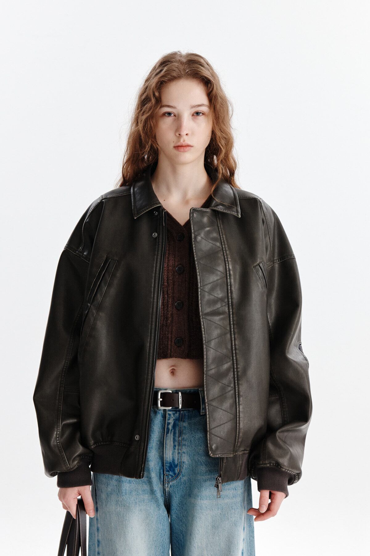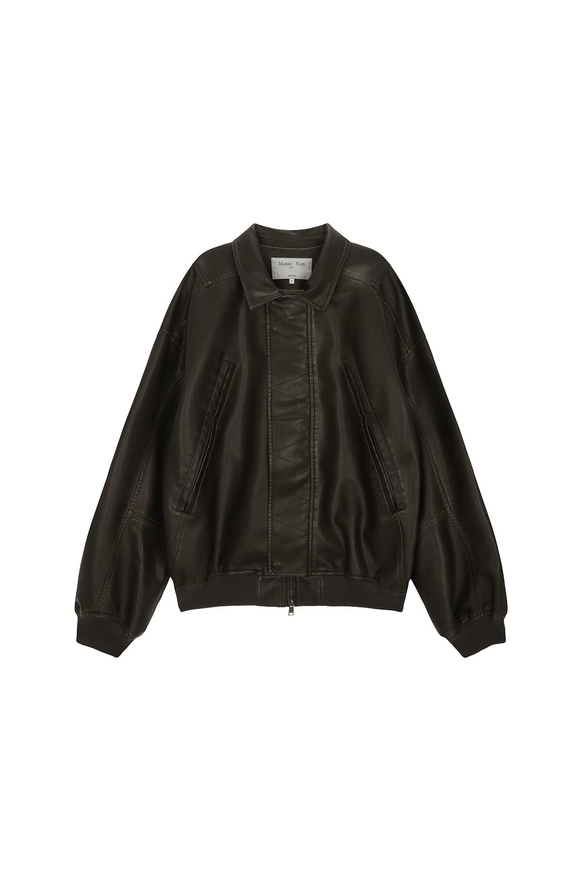 [Matin Kim] BACK PRINTING WASHED LEATHER JUMPER IN KHAKI BROWN