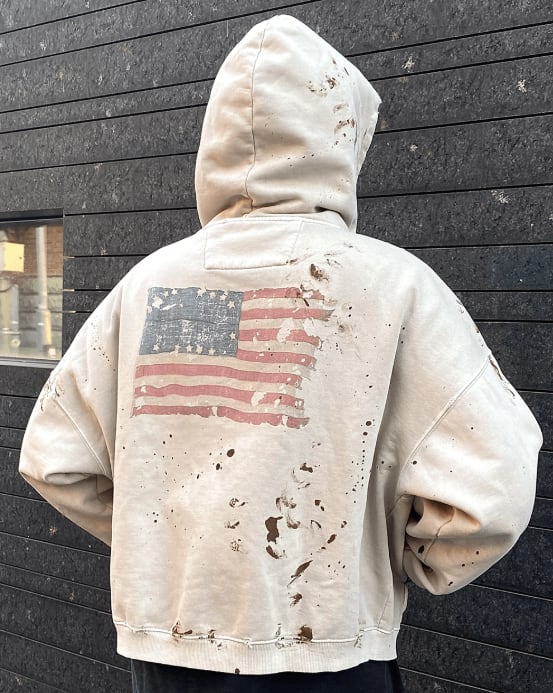 [UNDERMYCAR] VINTAGE AMERICAN FLAG DIRTY WASHED ZIPPED HOODIE - ECRU